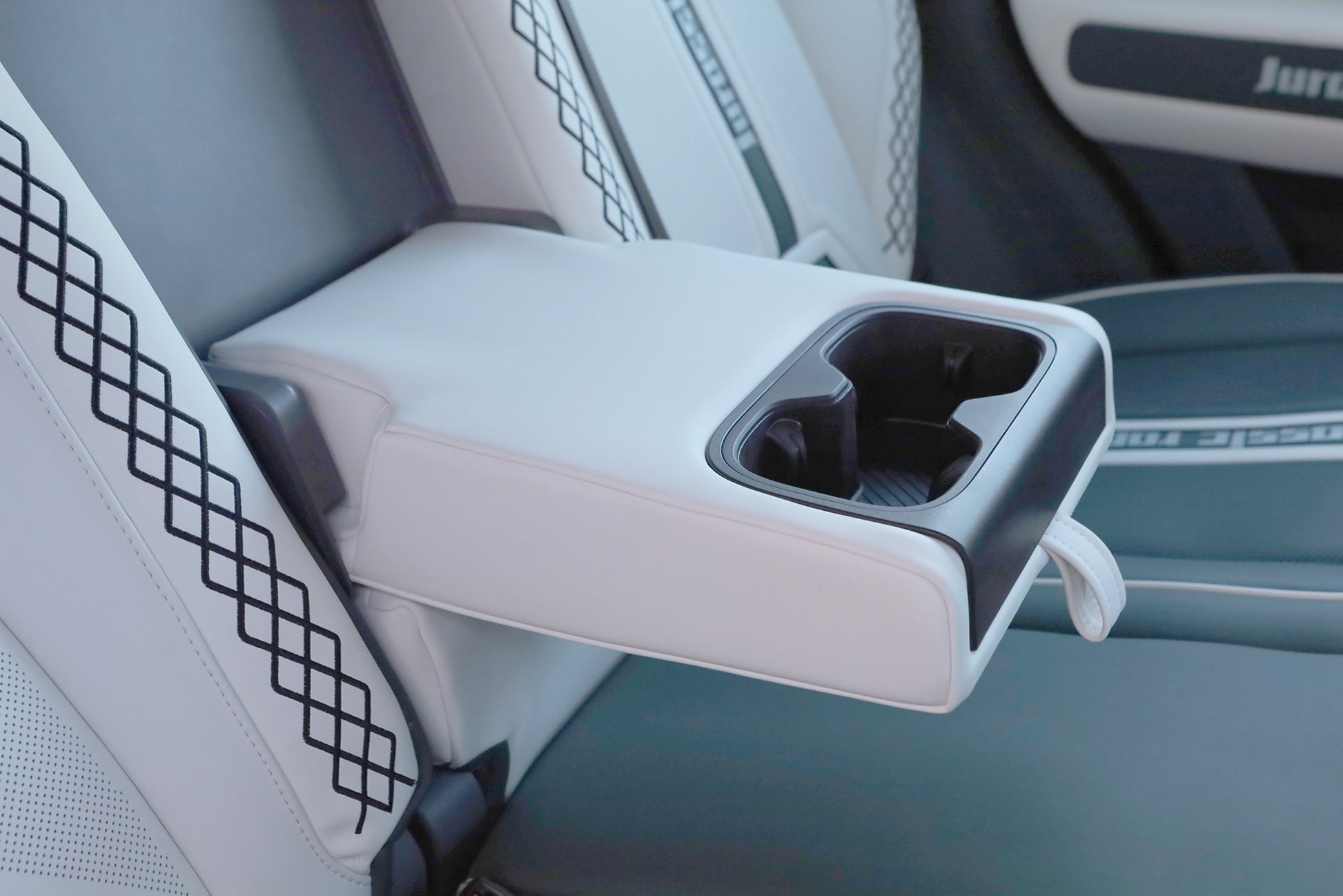 - White and military-green soft-touch upholstery with a silky, refined feel.