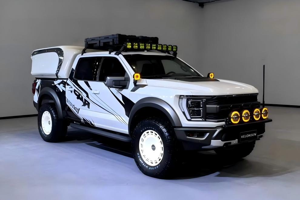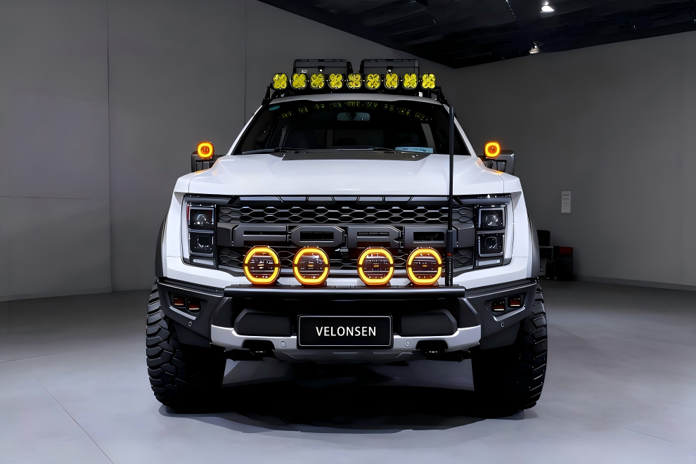 福特猛禽 - 白色版,基于猛禽硬核基因深度改装。黑白撞色战衣搭配定制越野包围与多组 LED 射灯,复古越野轮毂 + 全地形轮胎强化通过性;车顶行李架、阵列射灯及通讯天线一应俱全,兼具硬派颜值与全地形征服力,是为荒野探险量身打造的定制化越野猛兽。