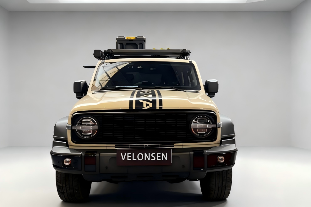 - 车身轮眉、前后保险杠采用防刮碳纤维纹理材质,搭配侧门攀登梯,强化户外探险的实用性与抗造性。